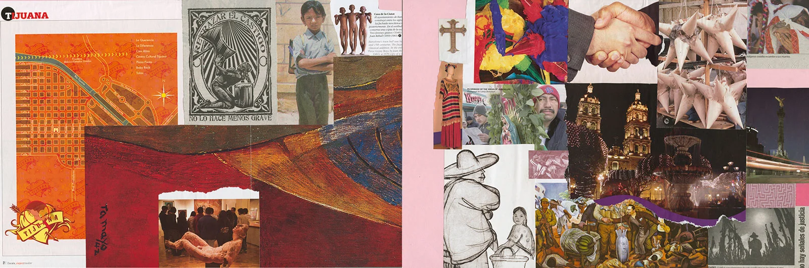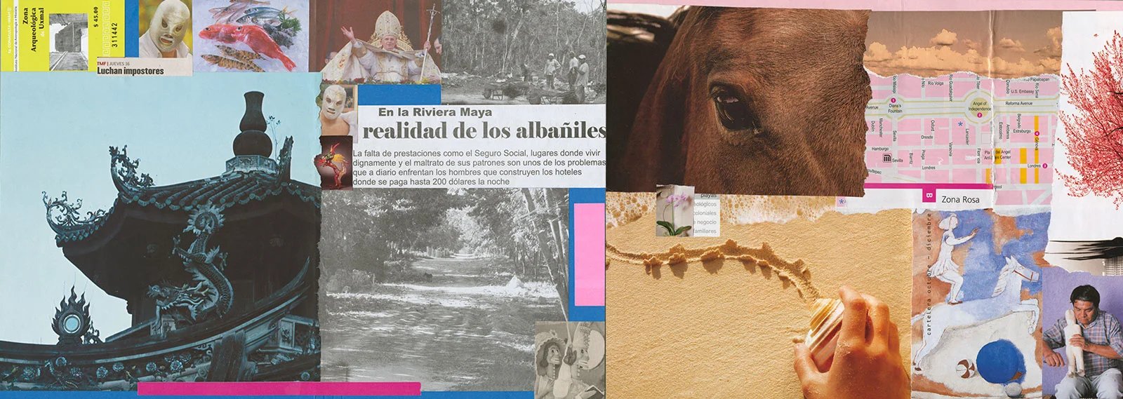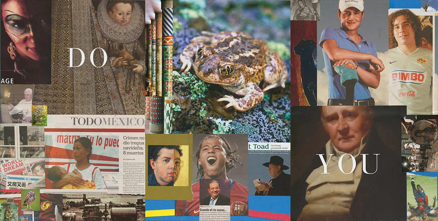 This series of collages was completed during a visit to Mexico City and to Merida, Yucatan and the pyramid sites of the Yucatan peninsula. Using found images, glue stick, scissors and office file folders, they served to record my experiences; from the poverty of the indigenous peoples living amidst the traces of their ancient cultural ruins to the frenetic energy of Mexico City.