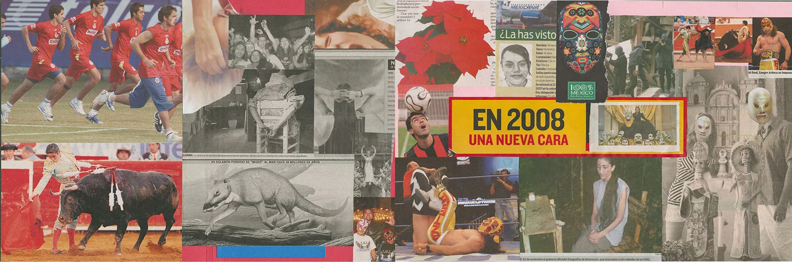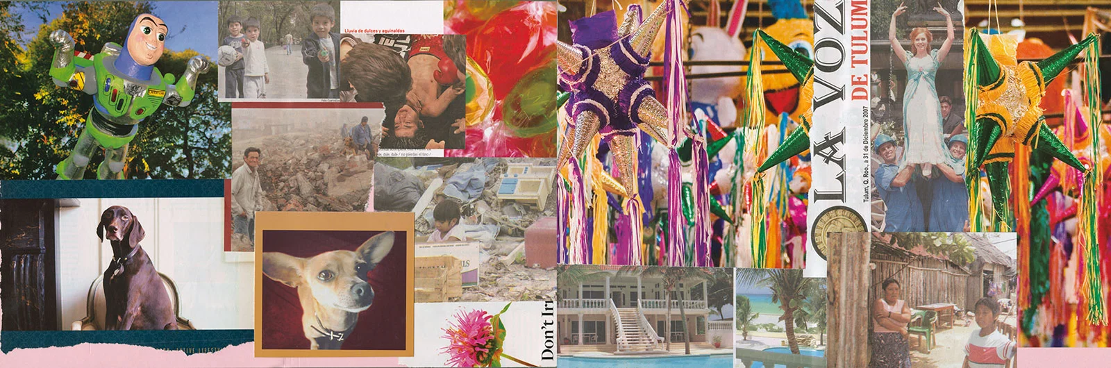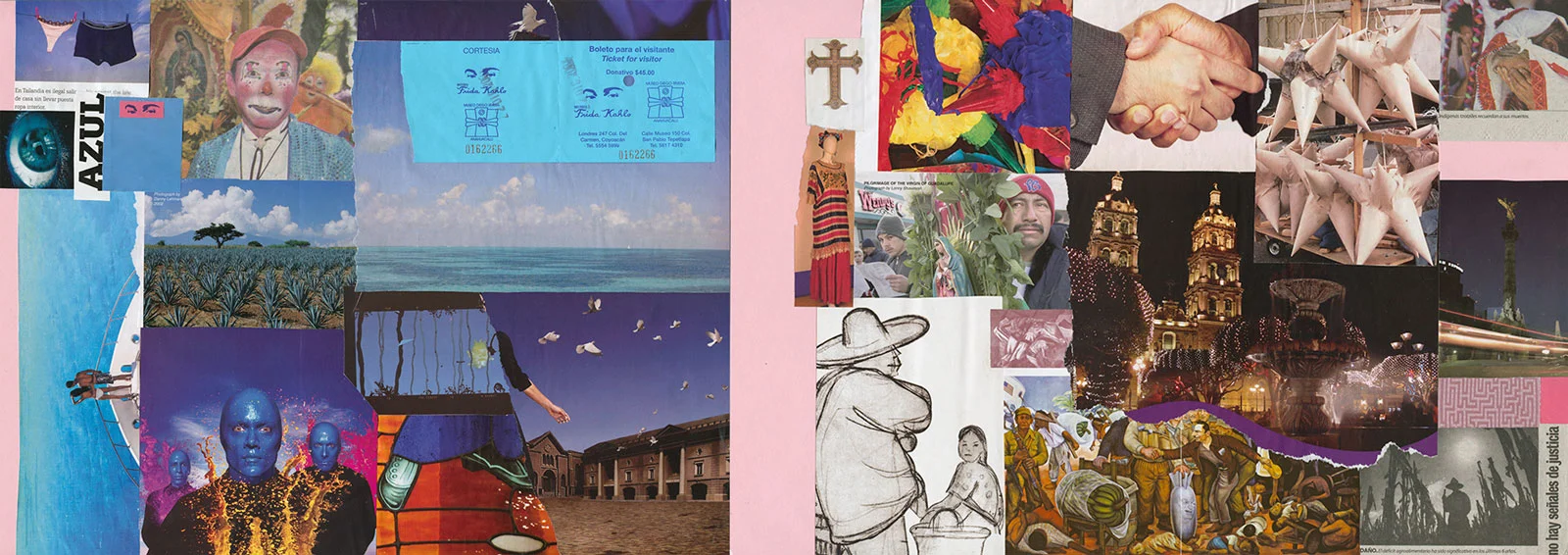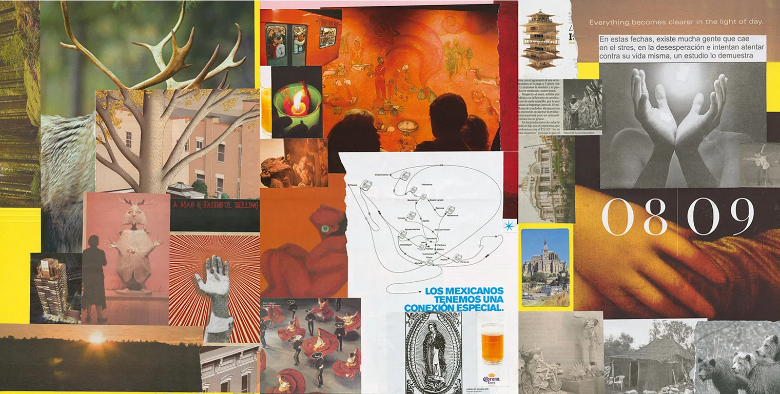 This series of collages was completed during a visit to Mexico City and to Merida, Yucatan and the pyramid sites of the Yucatan peninsula. Using found images, glue stick, scissors and office file folders, they served to record my experiences; from the poverty of the indigenous peoples living amidst the traces of their ancient cultural ruins to the frenetic energy of Mexico City.